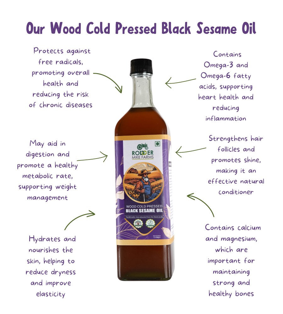 Rodder Mike Farms' wood cold pressed black sesame oil is a nutritional treasure, offering a rich source of essential fatty acids that support cardiovascular health and help lower cholesterol. Our cold-pressed sesame oil is abundant in antioxidants, which combat oxidative stress and inflammation. Packed with vitamins E and B, it promotes healthy skin and hair, while also providing calcium, magnesium, and zinc for strong bones and overall wellness. Sourced from the finest seeds in West Bengal, our traditionally crafted wood-pressed oil delivers exceptional health benefits in every drop.
